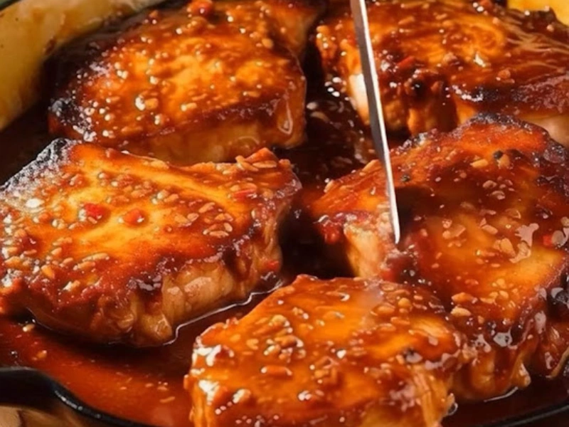 Cook uncovered for 25–30 minutes, until the pork reaches an internal temperature of 63°C (145°F) and the sugar has melted into a caramelized glaze.