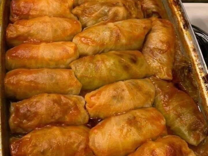 A hearty, comforting dish made with tender cabbage leaves wrapped around a savory beef-and-rice filling, all simmered in a rich tomato sauce.
