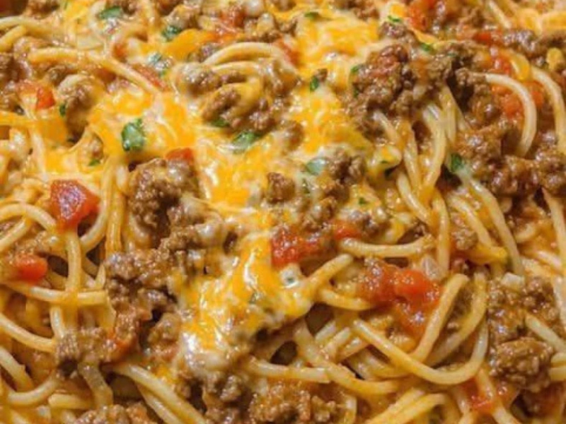 Imagine tender strands of spaghetti, savory browned beef, a rich garlic-tomato sauce, and gooey melted cheese—all cooked together in one skillet. No boiling water, no extra dishes, no stress.
