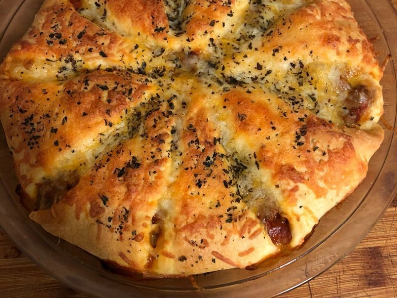 Separate the crescent dough into 8 triangles. Arrange them in an ungreased 9-inch pie dish, placing the wide ends toward the center and letting the pointed ends hang slightly over the edge.