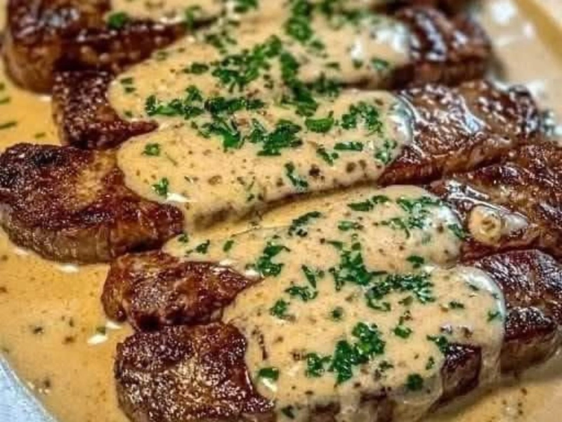 This dish showcases tender, perfectly seared steak with a caramelized crust and a juicy pink center, smothered in a luxurious garlic-cream sauce. The sauce is smooth, buttery, and aromatic — infused with garlic, herbs, and a subtle tang from Dijon mustard. It’s the definition of simple sophistication.