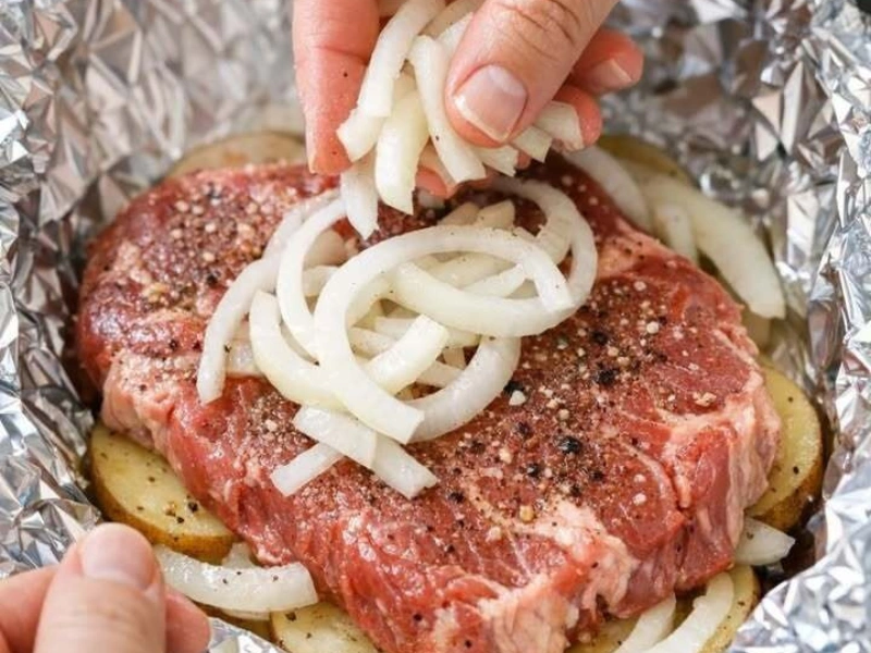 - Add a base layer of sliced onions—this keeps the steak moist and adds sweetness.