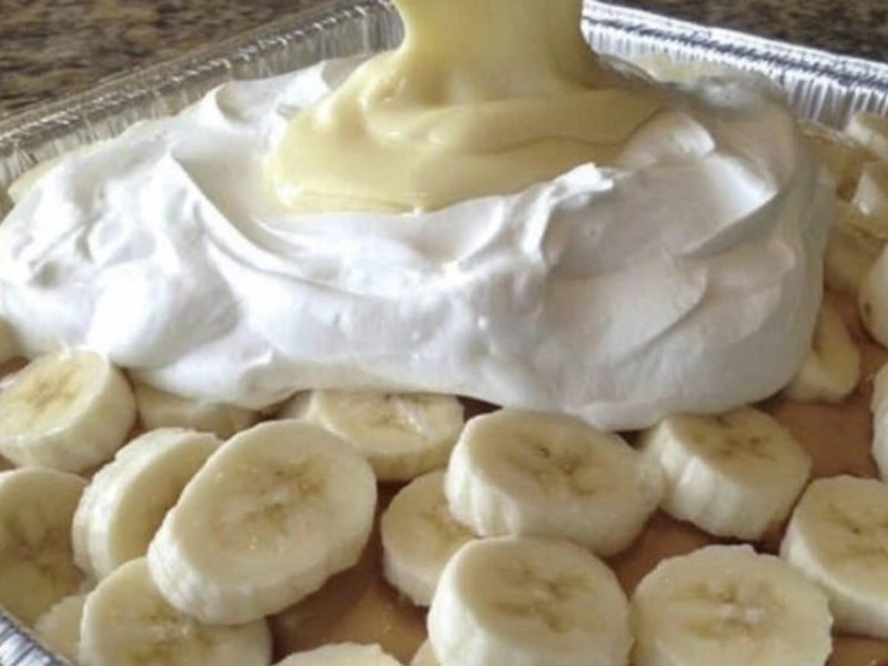 Spread the whipped cream evenly over the top. If desired, finish with crushed vanilla wafers, a light caramel drizzle, or toasted coconut for added texture.