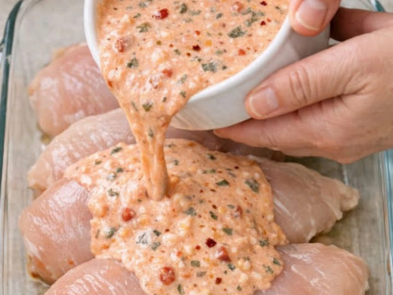Tender chicken cooks gently in a rich tomato and basil sauce, becoming juicy and flavorful while the oven does all the work. No constant stirring, no complicated steps—just a simple dish that fills your kitchen with a warm, inviting aroma.
