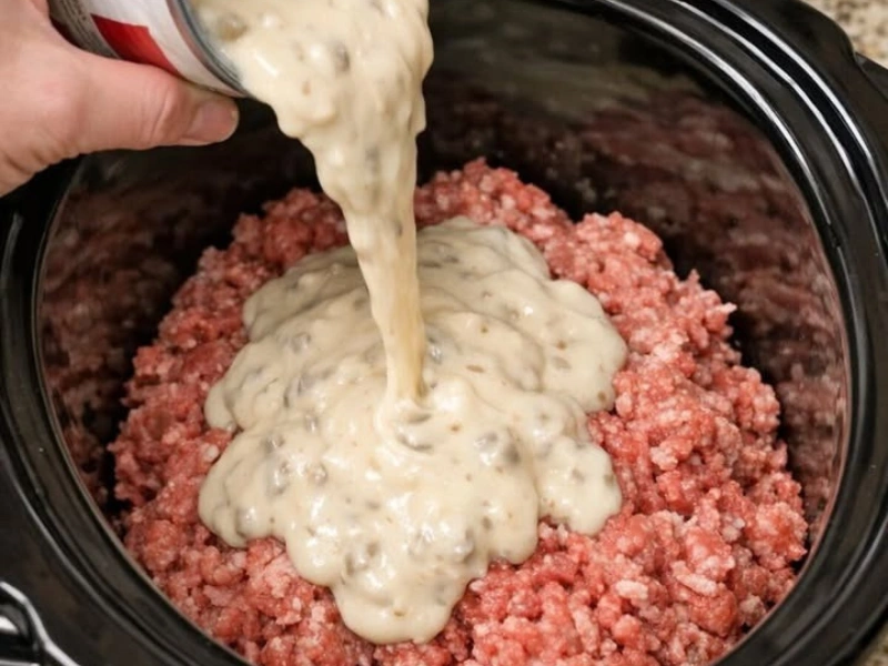 Pour cream of mushroom soup over raw ground beef, along with 4 ingredients, into slow cooker for a hearty casserole that’s the one everyone asks for