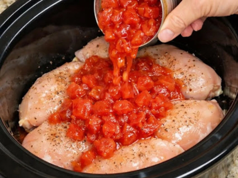 In a separate bowl, mix the diced tomatoes with paprika and optional tomato paste. Pour this mixture over the ingredients. Leave everything layered—no need to stir.