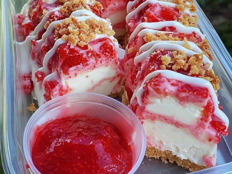 Topped with a drizzle of strawberry sauce and white chocolate, these mini desserts deliver the perfect harmony of rich, fruity, and crunchy in every bite.